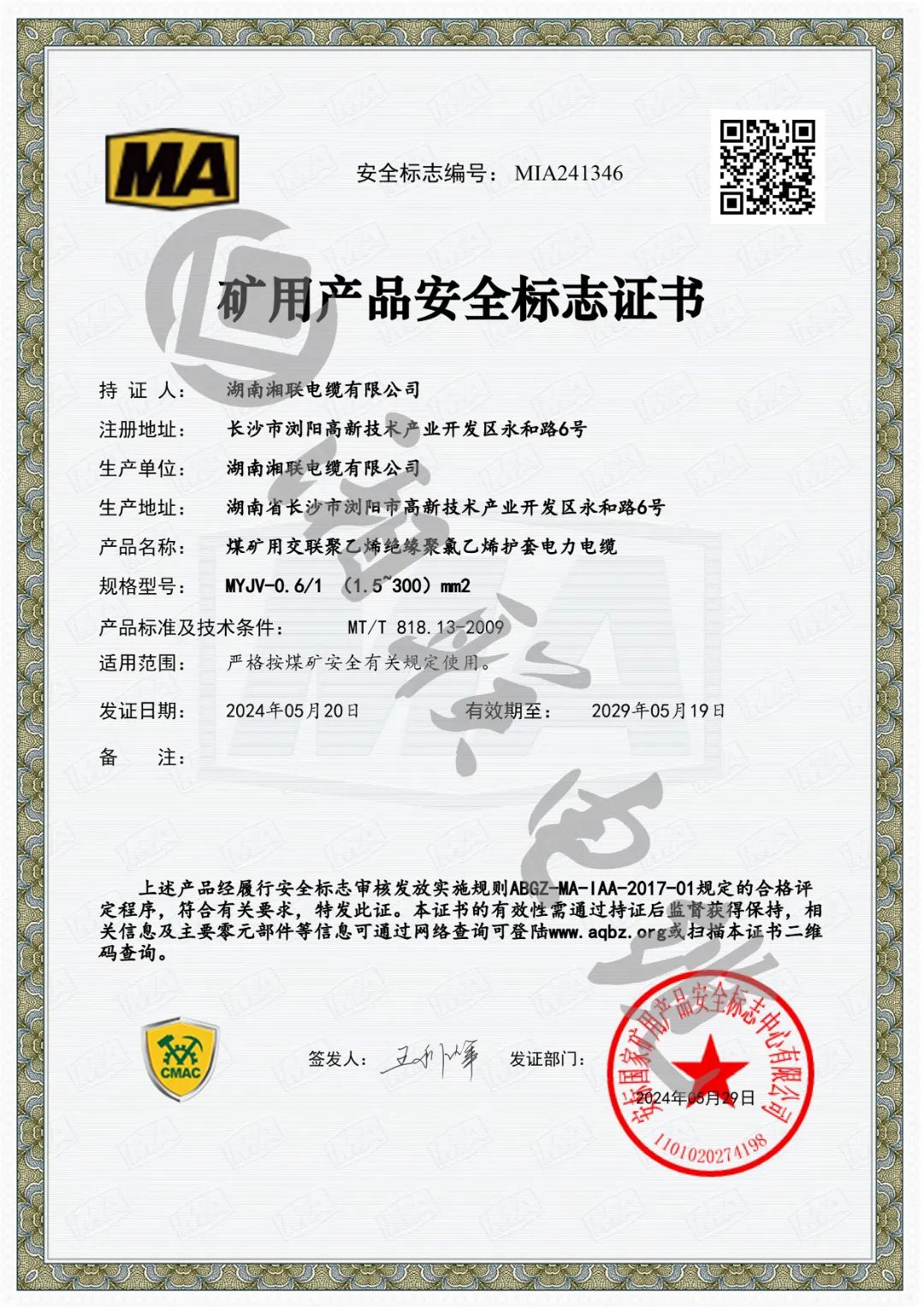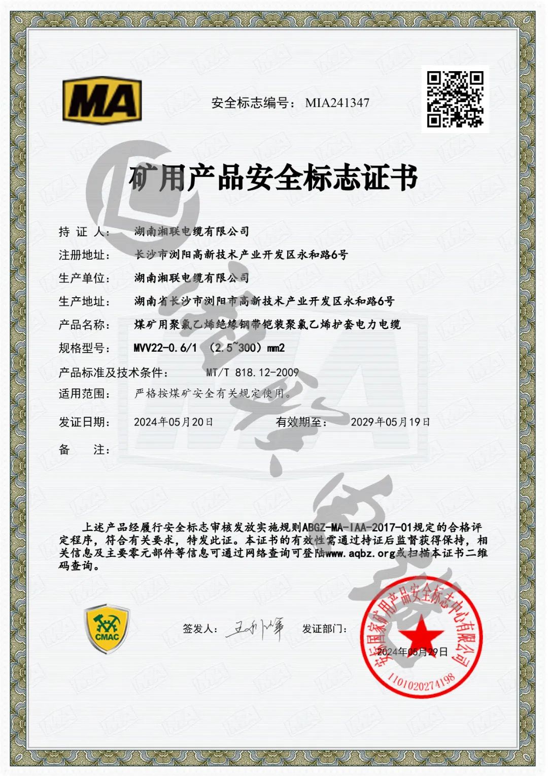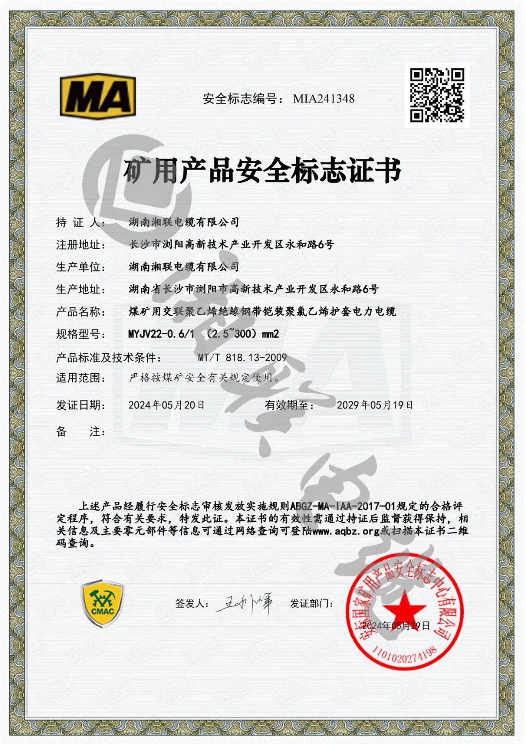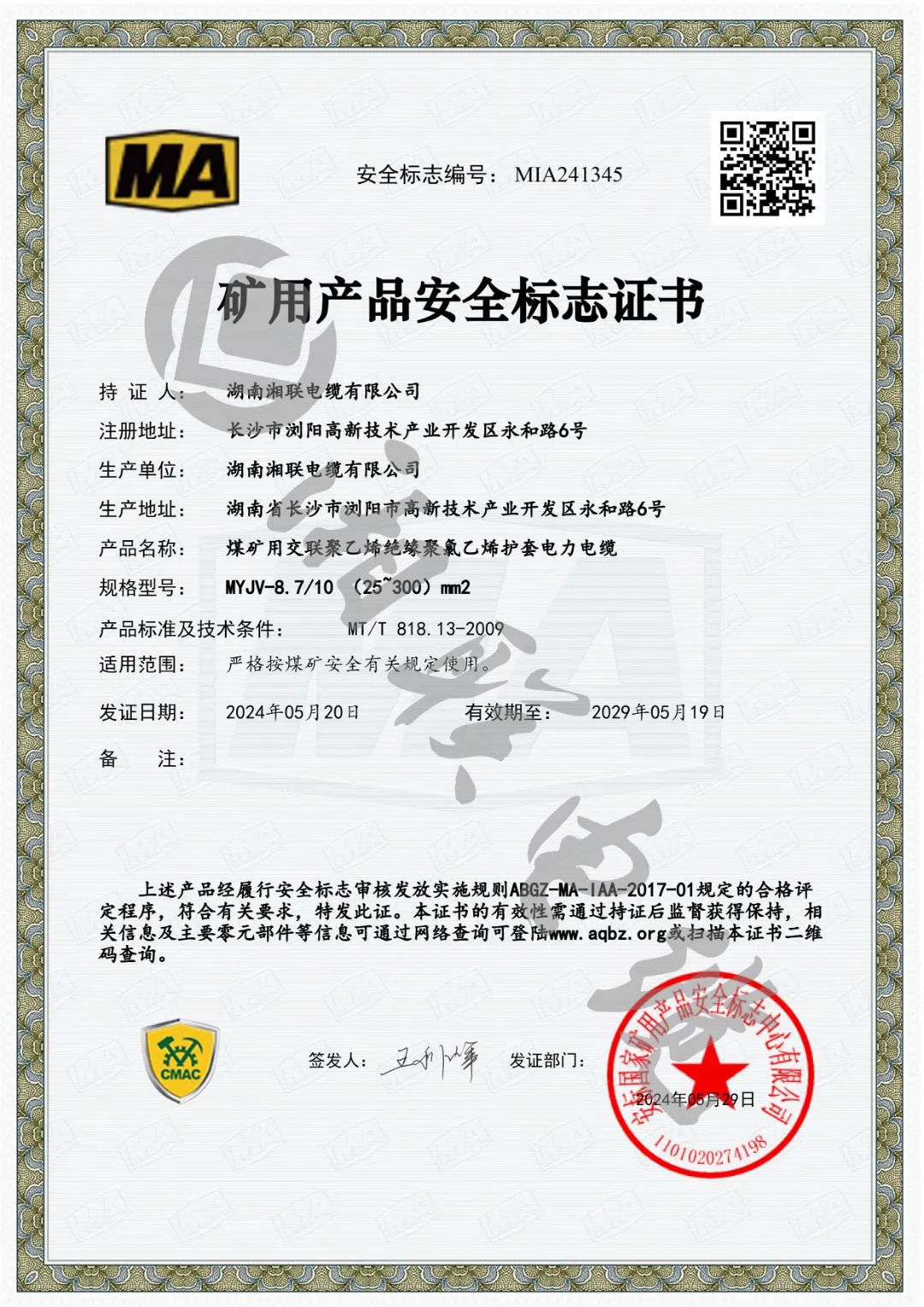 權(quán)威認證,湘聯(lián)電纜順利取得礦用產(chǎn)品安全標志證書!